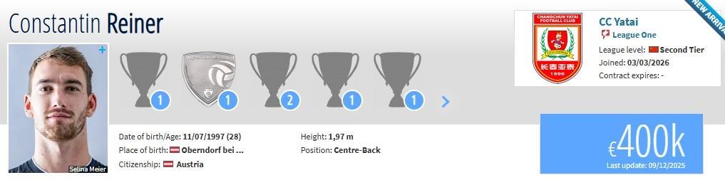 北京时间3月3日,德转更新,原陕西联合外援赖纳加盟长春亚泰。