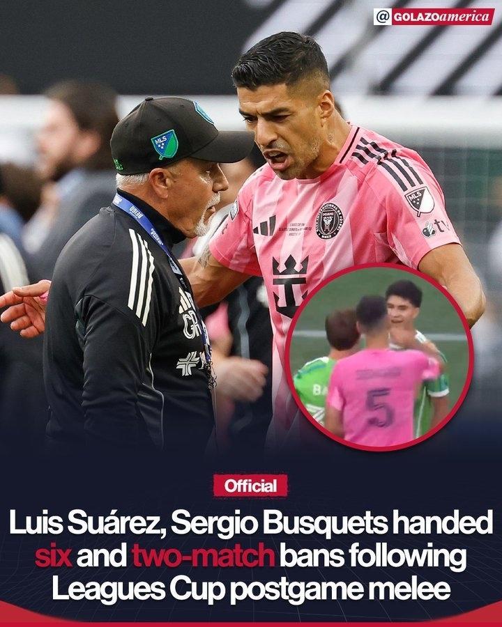 北京时间9月6日,北美联盟杯组委会官方宣布,经过赛事纪律委员会决定,38岁的迈阿密国际前锋苏亚雷斯,因在联盟杯决赛中朝对方人员吐口水并且踩踏对手,将被禁赛6场。此外,迈阿密国际队的另外一员大将布斯克茨,也因暴力行为被禁赛2场。